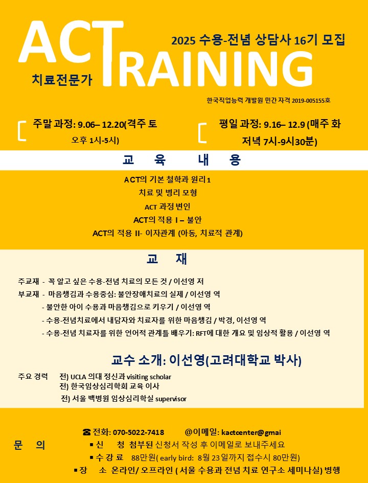 [공지] 2025년 16기 ACT 전문가(수용-전념 상담사) 자격과정 training
